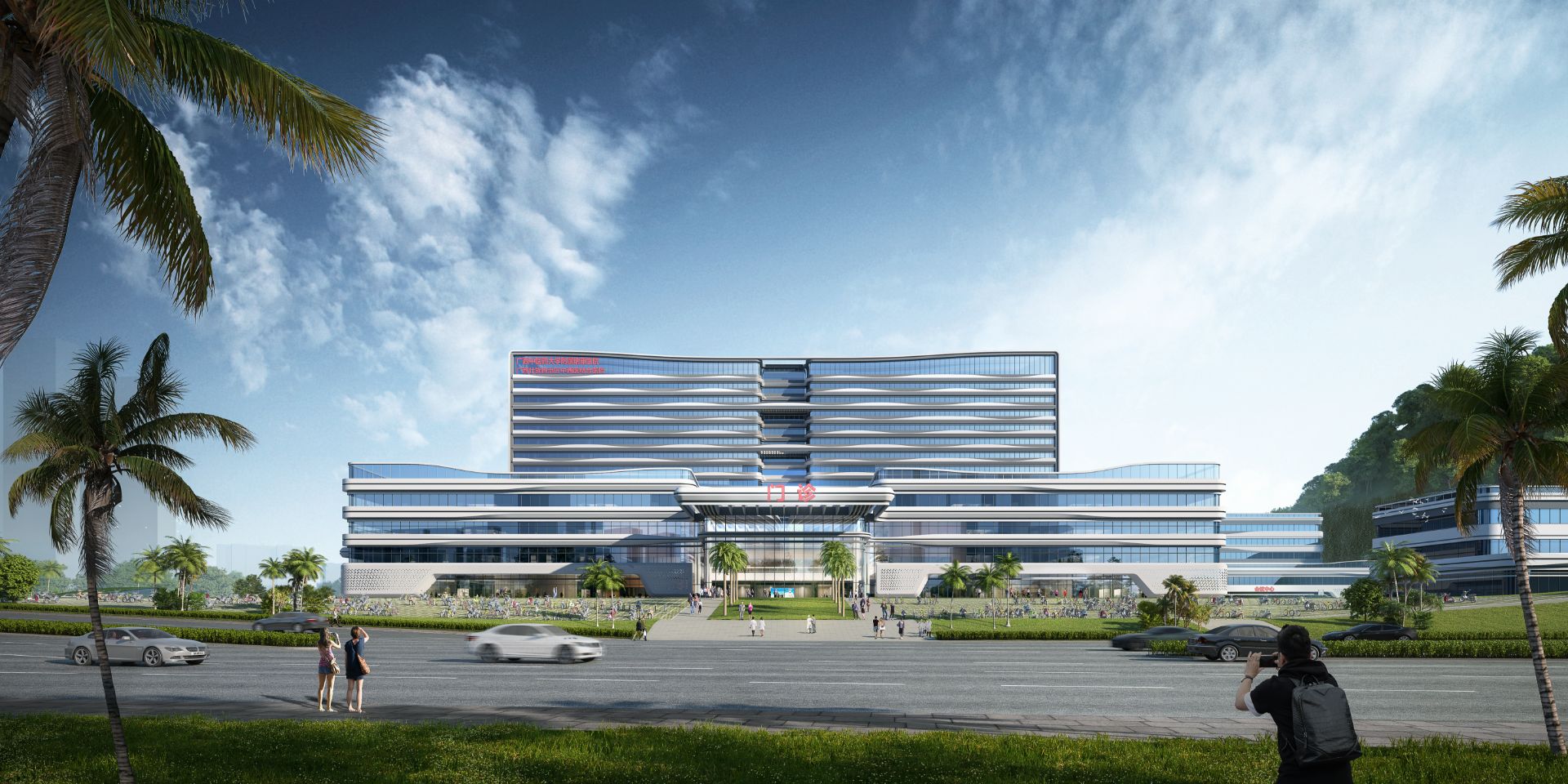 建筑形態依據中西醫結合醫院的特點,采用中軸對稱的傳統布局方式,完美延續了中國傳統文化的精神理念。同時,建筑形象綜合了現代、傳統與廣西本土的地域元素,主要特色為:1.在主要入口頂部設置中國傳統建筑屋檐,展現博大精深的中國建筑特色和古韻盎然的東方審美情調。2.裙房立面結合廣西壯族采用的“壯錦”紋理,提取生成出現代化的立面形式,使延續千年的地方文化在當代建筑設計中得到創新與傳承。3.大面積流暢、富有韻律感的橫向線條引人矚目,以其時尚的造型、律動的美感為該地區帶來嶄新的城市風貌。4.結合廣西地區自然環境的特點,通過下沉庭院,建筑中庭,屋頂綠化,局部架空層等方式打造三維立體的綠色醫院,優美的生態環境與綠蔭遮蔽的城市環境高度融合。