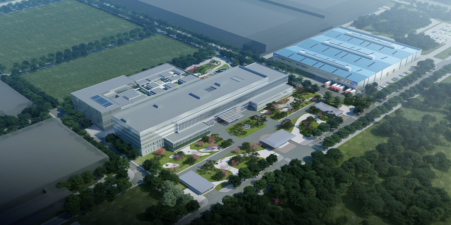 綠化設計以因地制宜、崇尚自然、美化環境為主導思想,以體現建筑設計風格為原則,使綠化和建筑相互融合,相輔相成,使環境成為公司文化的延續。植物配置以鄉土樹種為主,主要以常綠樹種作為“背景”,四季不同花色的花灌木進行搭配,廠區之中道路筆直通順,使全區的綠地形成以集中綠地為中心的綠地體系。此外,綠化景觀設計圍繞廠區文化的內涵,營造出“五境”,即“品味高雅的文化環境,嚴謹開放的交流環境,催人奮進的工作環境,舒適宜人的休閑環境,和諧統一的生態環境”。