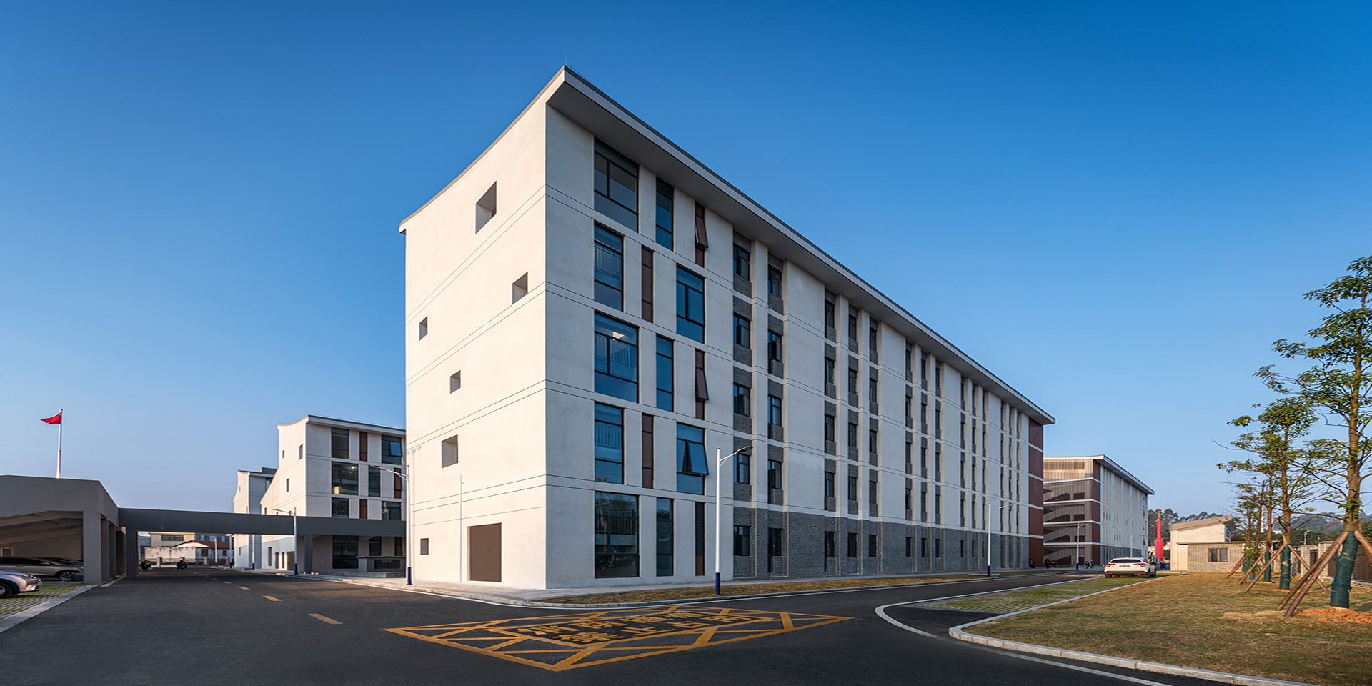 本項目設計結合江西省龍南市的城市環境、區域文化特征、城市發展脈絡以及街道空間肌理等,采用棋盤式網絡結構,有效地將教學功能、綜合功能串聯在一起,構建無風雨交通步行系統。該網絡體系不僅強化了中軸對稱,同時還可以不斷向南向延伸,滿足分期建設的需求。