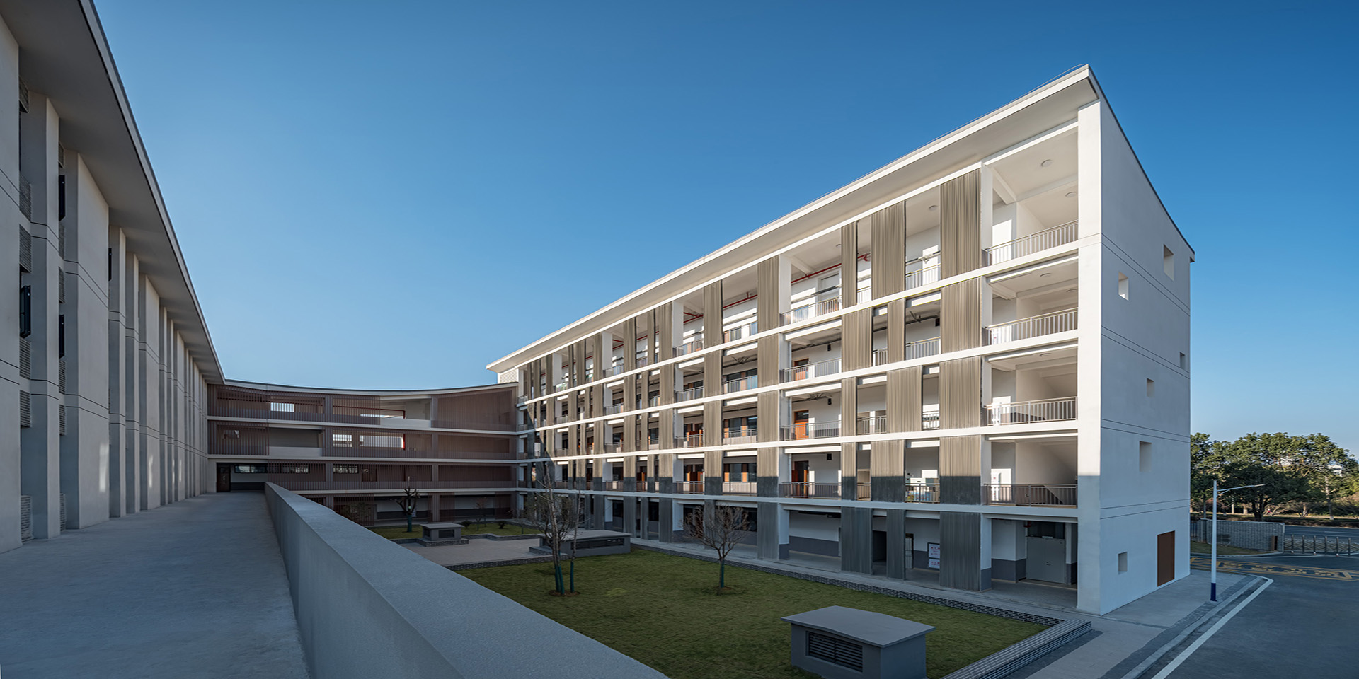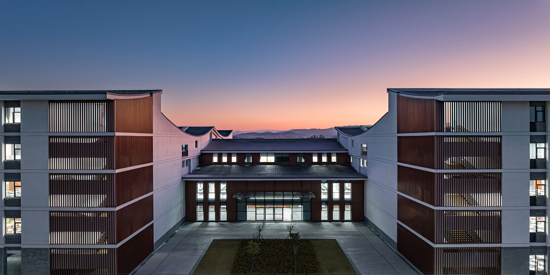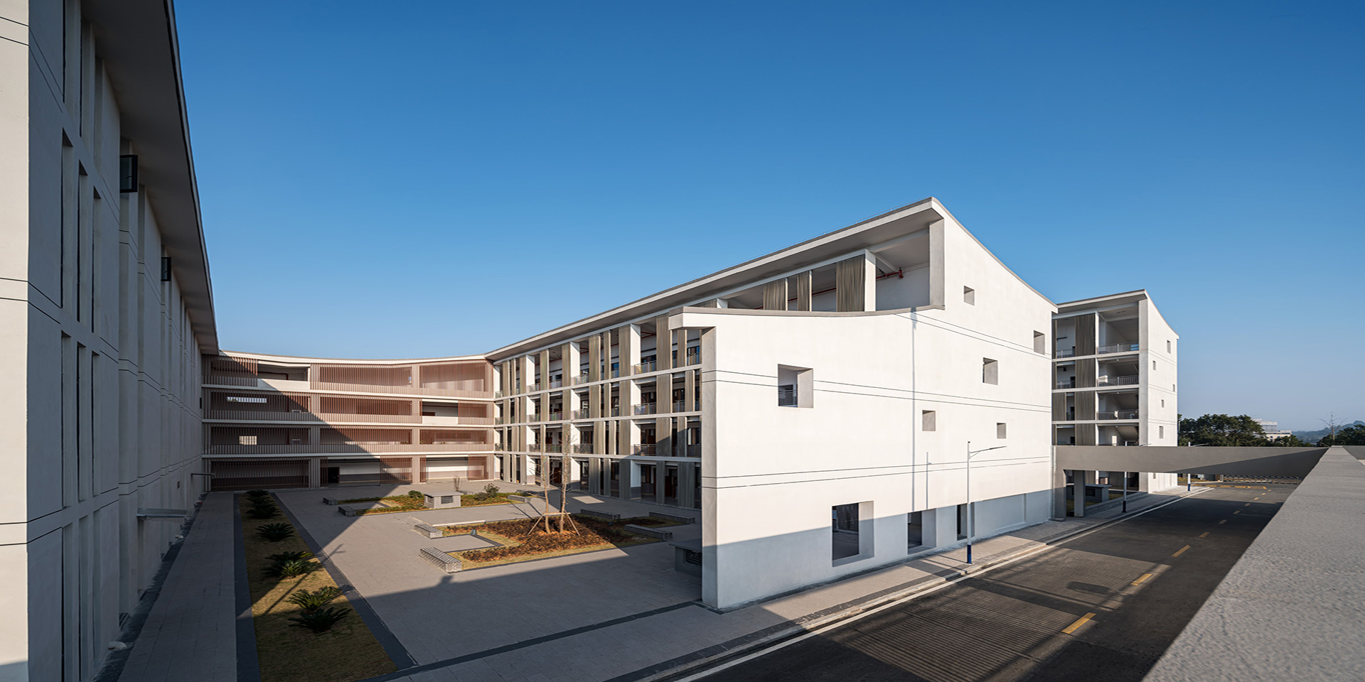 為滿足功能使用需求,我們將南北向面向庭院的界面,營造出“豐富多元”的姿態,通過豎向格柵和竹模混凝土板的設置,與實墻形成虛實對比,在虛實之間完成傳統“外實內虛”特質的現代轉換,同時創造出豐富的光影變化和多樣空間,學生可以在庭院間、在走廊上自由地游走、眺望、嬉戲。而將東西向的山墻界面營造出“防守”的姿態,在不同標高處設有洞口或燈龕,這些洞口、燈龕既是對傳統民居樣式的回應,又創造出很多有趣的界面和景框,帶給學生更豐富有趣的空間體驗。