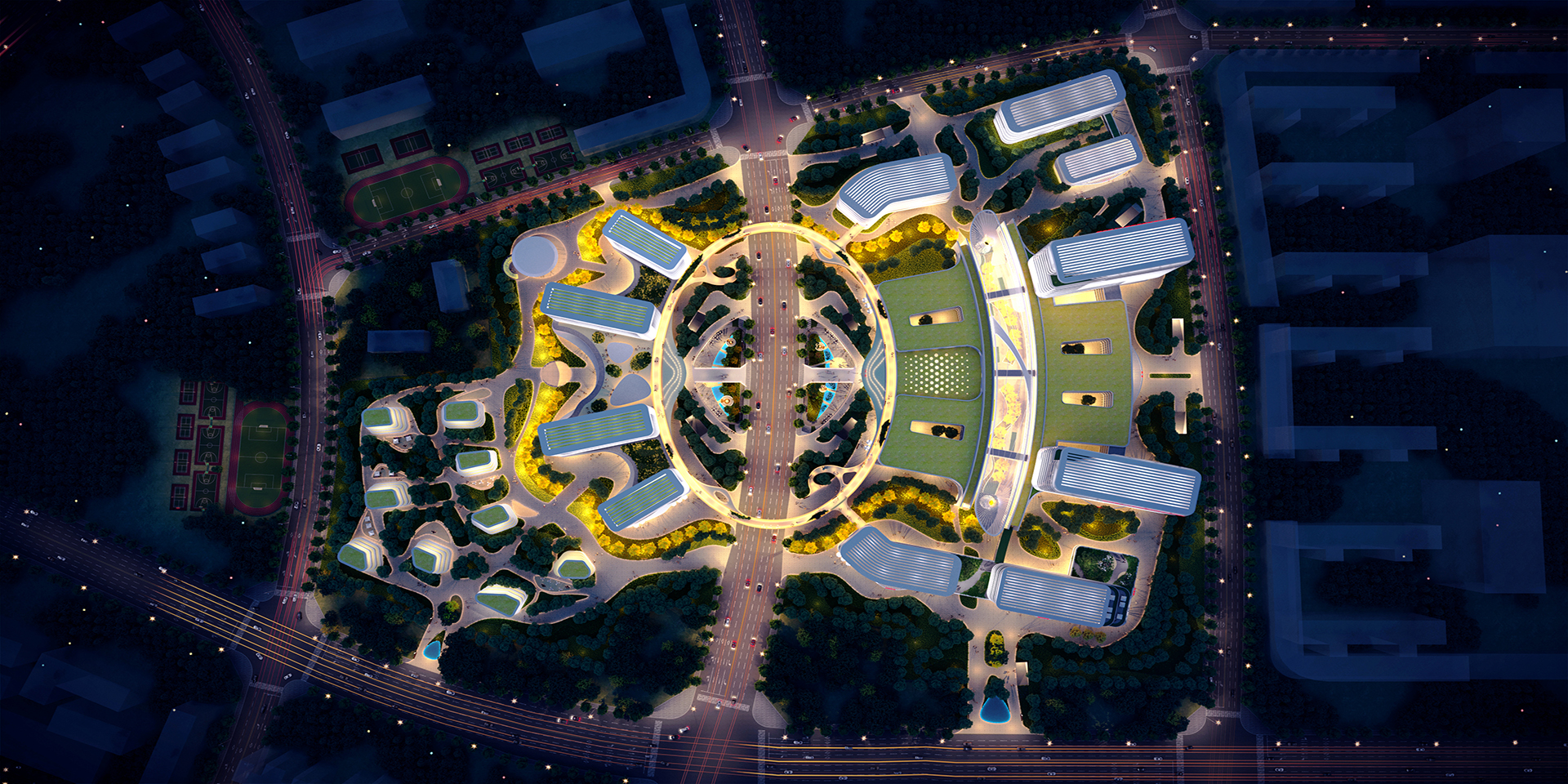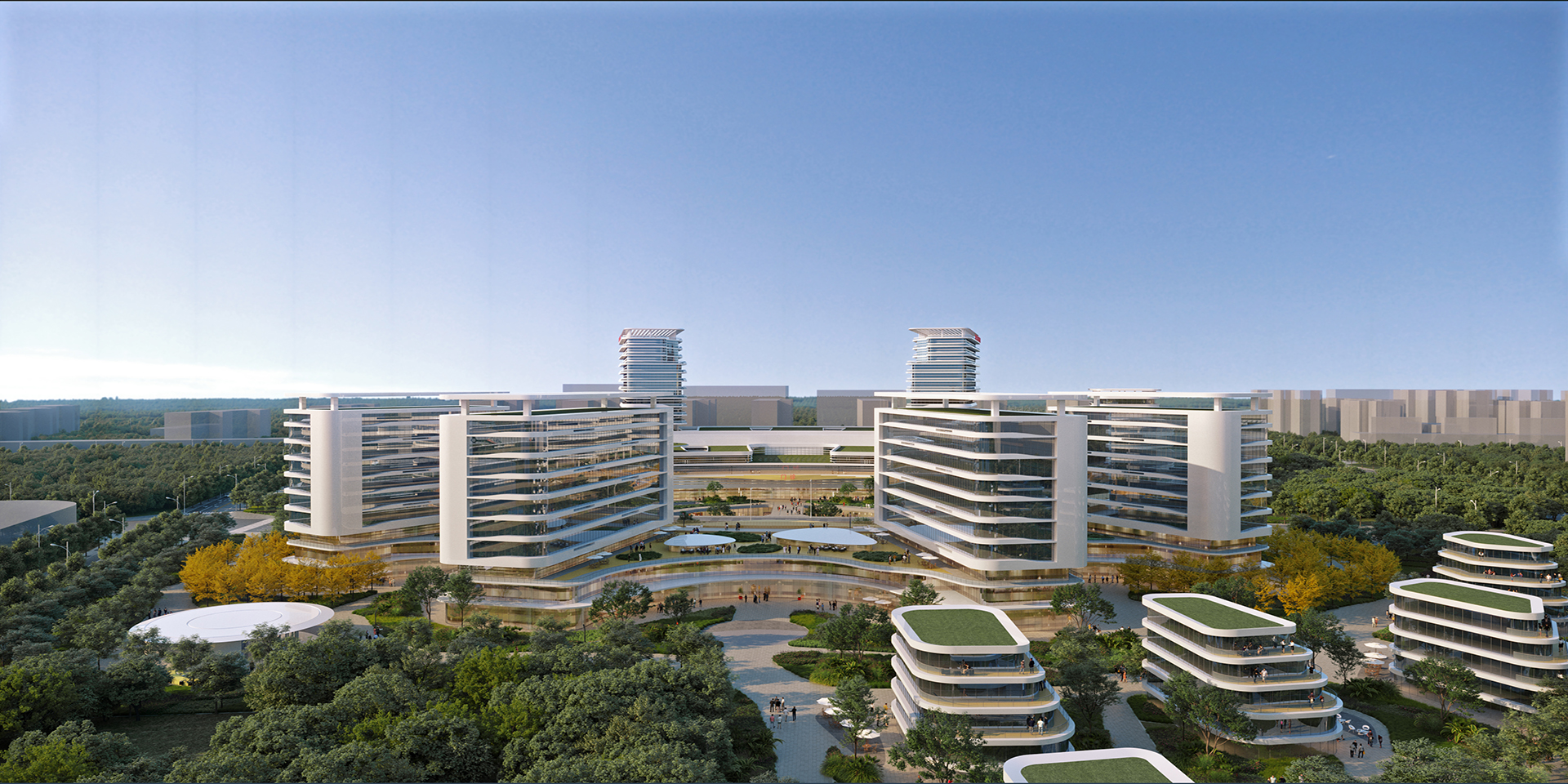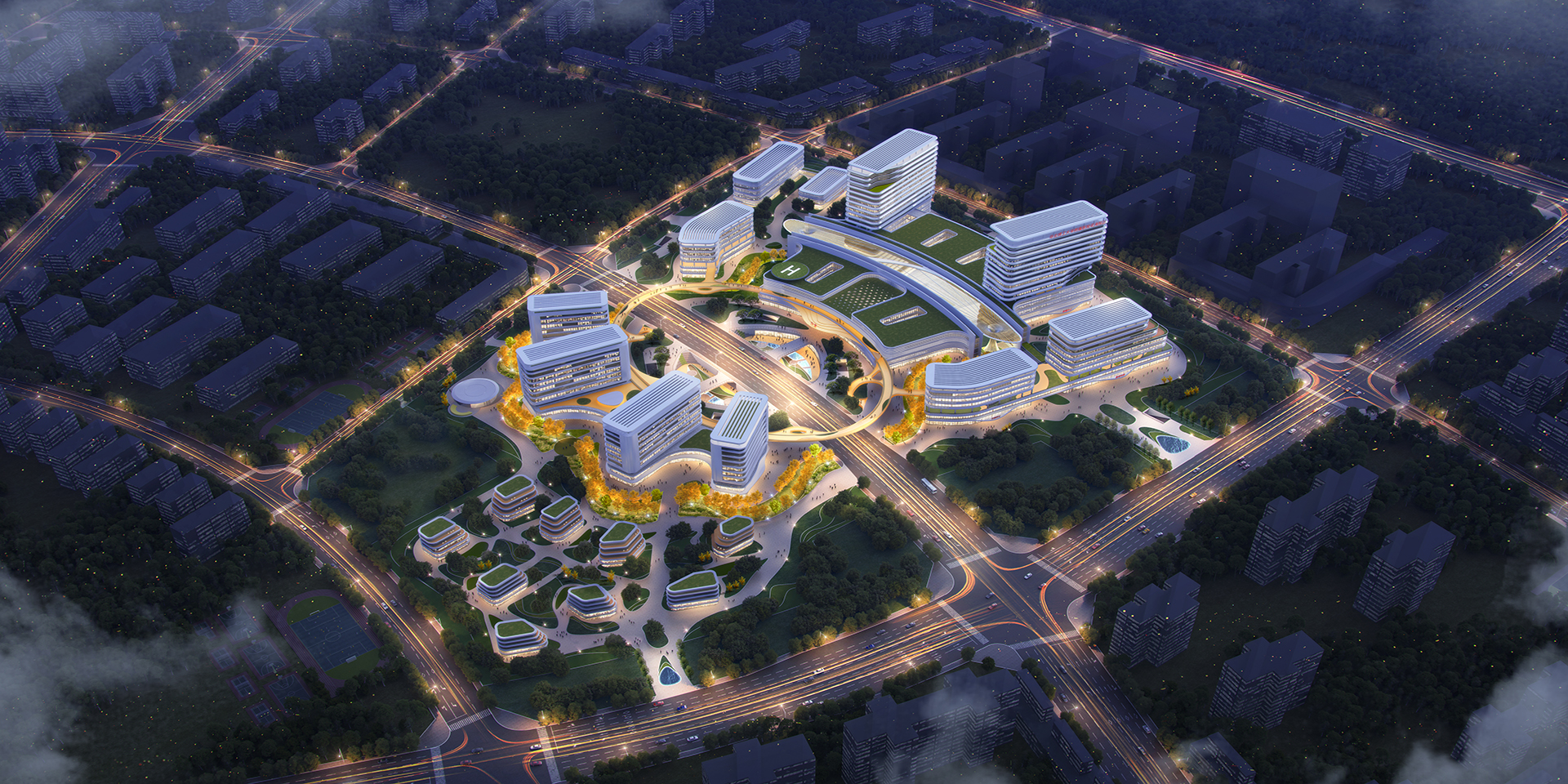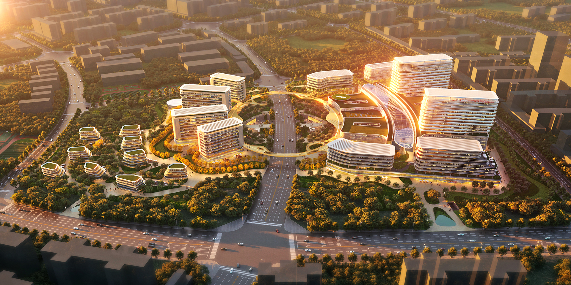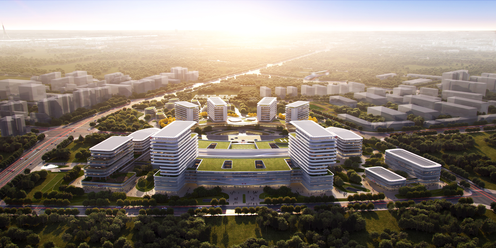 方案提出“樞紐式交通(tong)”、“多中(zhong)心功能(neng)”、“主(zhu)干式物(wu)流(liu)”、“平(ping)疫結合”、“療愈性(xing)空間”、“醫教研一體(ti)”、“綠色(se)智慧安全(quan)”的七大設計特(te)點。整體(ti)立意突出,結合項(xiang)目(mu)地(di)緣優勢(shi)和(he)唐(tang)山港口文化,提煉出“花海之畔、生命綠舟”主(zhu)題,通(tong)過建(jian)筑(zhu)(zhu)造(zao)型(xing)與空間環境(jing)的塑造(zao),各棟建(jian)筑(zhu)(zhu)猶如(ru)一艘(sou)(sou)艘(sou)(sou)船舶停靠(kao)在花海之畔,成為(wei)唐(tang)山的健康碼頭,冀東(dong)北的生命綠舟。
