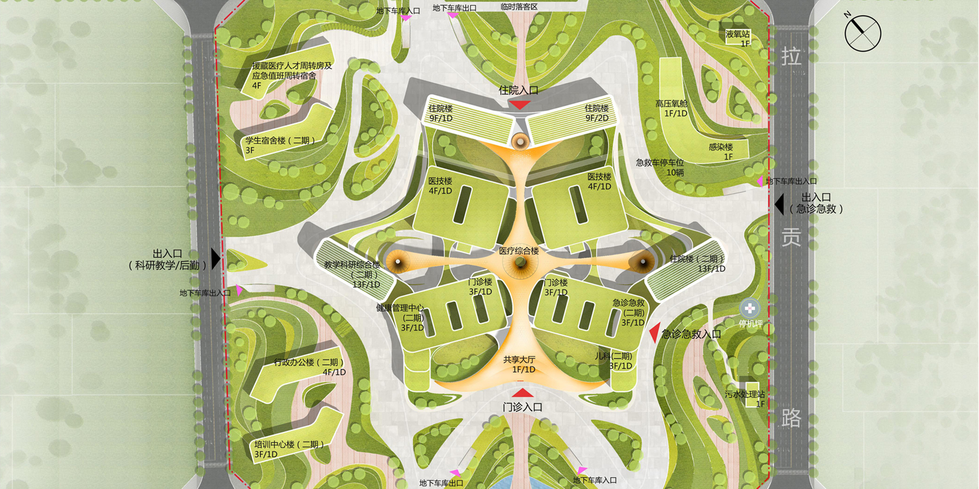 本項目根據功能分醫療區、后勤保障區、行政區。醫院總體床位規模為1499張,其中一期工程床位規模為800張。主要建設內容包括醫療綜合樓、組團式援藏醫療人才周轉房及應急值班周轉宿舍、感染樓、高壓氧艙,以及液氧站、污水處理站及垃圾站、南門衛室、東門衛室等配套用房,建筑面積為121326.40平方米,其中地上100148平方米,地下21178.4平方米。